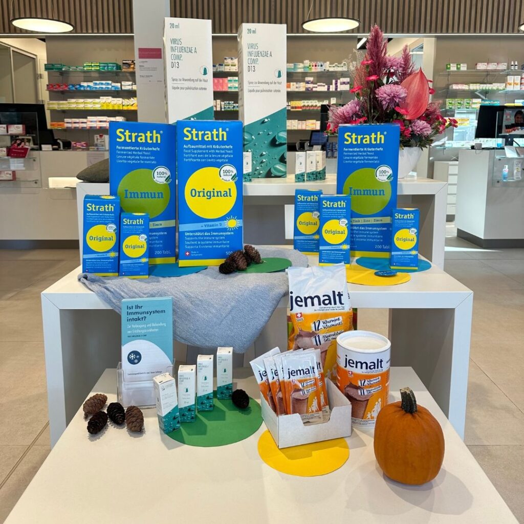 Mit einem starken Immunsystem kommen Sie gesund durch die kalte Jahreszeit. Achten Sie auf eine ausgewogene Ernährung, regelmässige Bewegung an der frischen Luft und ausreichend Schlaf. Auch genügend Flüssigkeit und Vitamine unterstützen Ihre Abwehrkräfte. Zusätzlich helfen Ihnen stärkende Mittel wie Vitaminpräparate und pflanzliche Immun-Booster, welche Sie bei uns in der Apotheke erhalten.